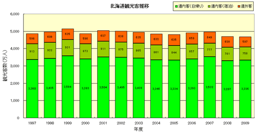 さて、北海道観光全体の推移を改めて見てみると、2008年度と2009年度とここ2年は落ち込みが続いています。